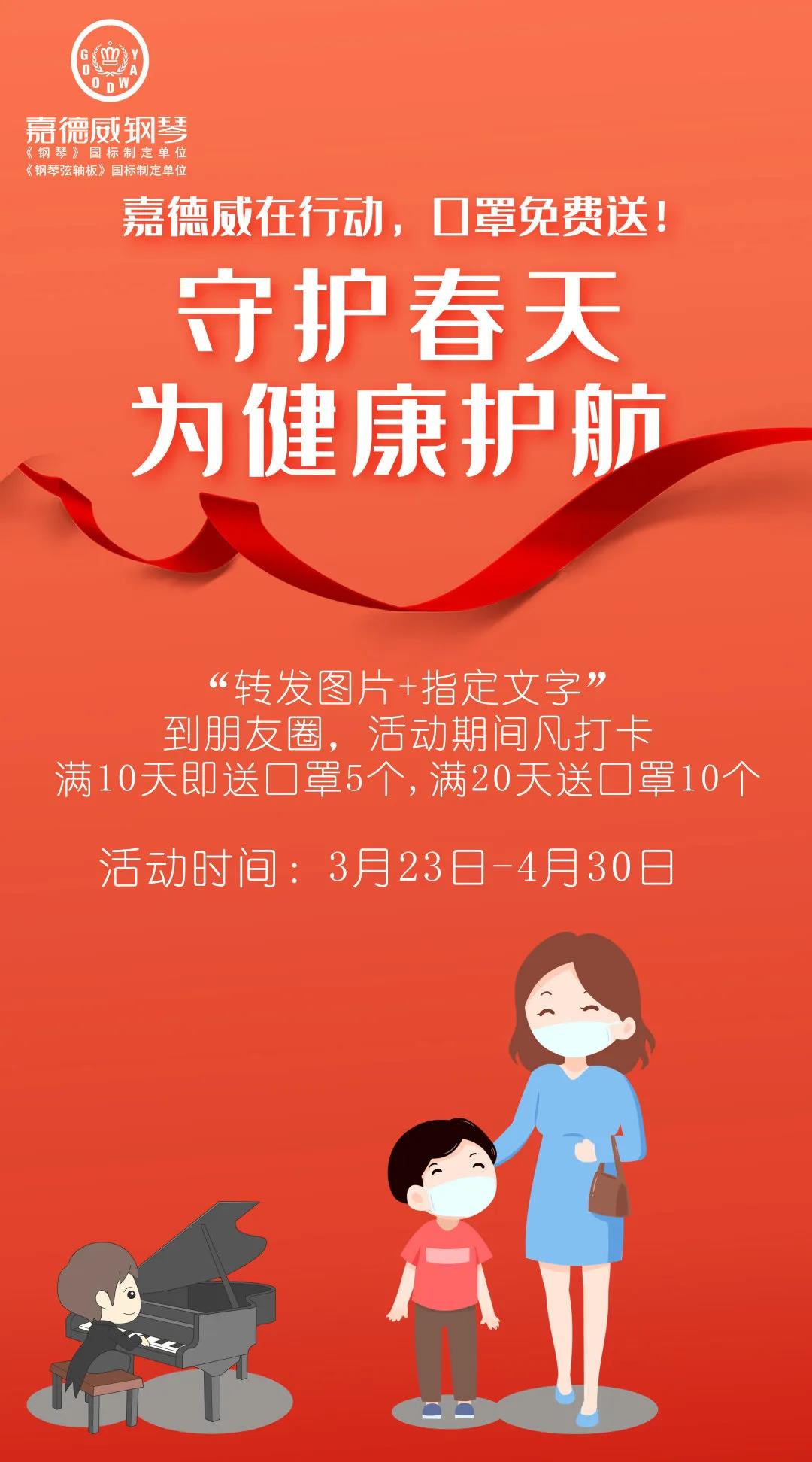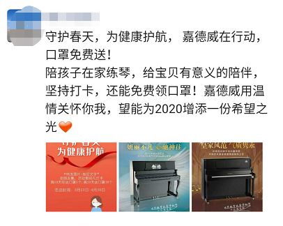 微信朋友圈“轉發(fā)圖片+指定文字”(守護春天,為健康護航, 嘉德威在行動,口罩免費送!陪孩子在家練琴,給寶貝有意義的陪伴,堅持打卡,還能免費領口罩!嘉德威用溫情關懷你我,望能為2020增添一份希望之光)